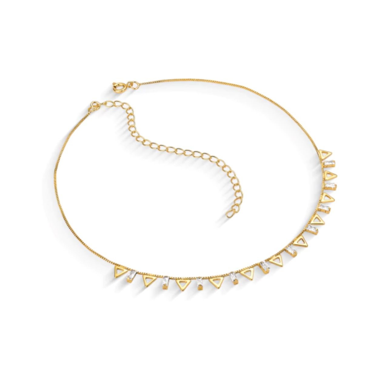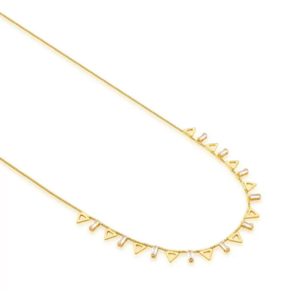 O Colar Triângulo banhado a ouro combina design moderno com a delicadeza das mini rivieras, que acrescentam um brilho sofisticado e sutil. Sua geometria elegante destaca o colo com leveza, tornando a peça perfeita para compor desde looks do dia a dia até produções mais refinadas. Um acessório versátil, feminino e cheio de estilo.